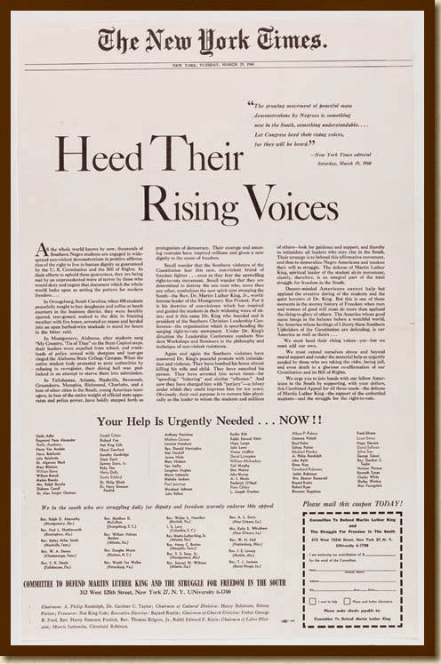 The Internet, Twitter, Facebook were a long way off when the Sullivan case began in 1960. It started when the NY Times published a civil rights group's full-page ad, with the title 'Heed Their Rising Voices,' that described the brutal treatment of civil rights demonstrators in the South. The ad solicited funds to defend Martin Luther King, Jr. against an Alabama perjury indictment.